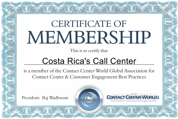 CONTACT CENTER WORLD CERTIFICATE OF MEMBERSHIP COSTA RICA'S CALL CENTER