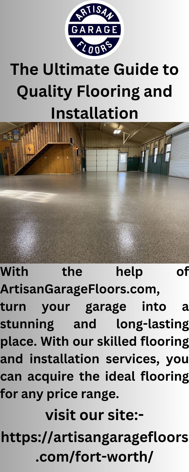 Your garage floor can be transformed by using ArtisanGarageFloors.com! Our epoxy flooring products are designed to create a durable, eye-catching finish. Experience the elegance and simplicity of a professionally placed epoxy floor today!